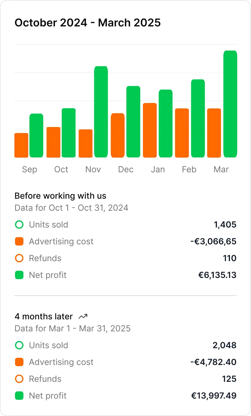 Keywords on Page 1 increased by 71%, Sales grew by 46%, Profit rose from €9.7K to €16K.